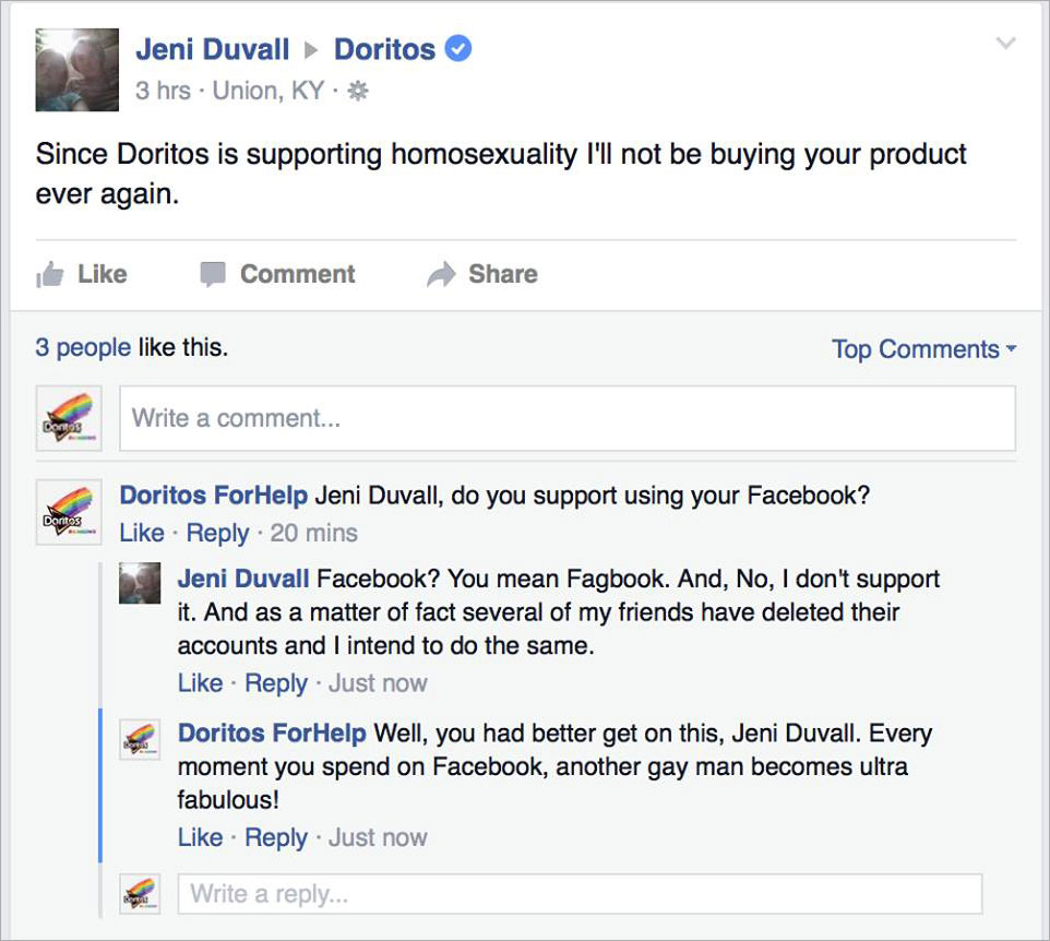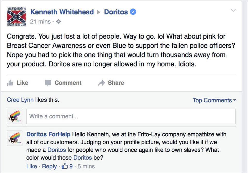 Take for instance, the work of Mike Melgaard, the lovable troll who posed as a Doritos Customer Service Rep, responding to irate customers after the company announced plans to start distributing rainbow chips in support of LGBT-Pride. Doritos themselves had no official comment to make, but when a company can get this much positive press for free, it’s hard to imagine them being very upset.